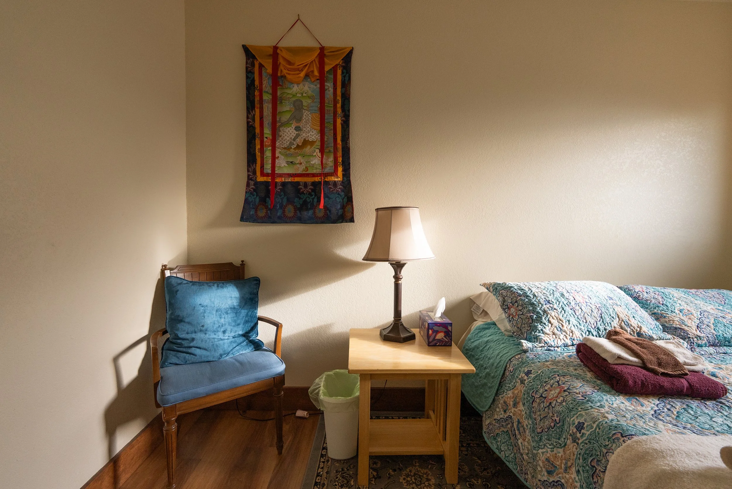 Our primary accommodation is a single room with a shared bath, offering a simple, peaceful space ideal for retreat participants and individual guests.